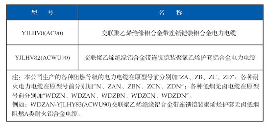 緊壓絞合鋁合金導體、阻燃交聯聚乙烯絕緣、軋紋聚酯帶繞包、鋁合金帶連鎖鎧裝護套、5000V及以上采用內、外屏蔽層。