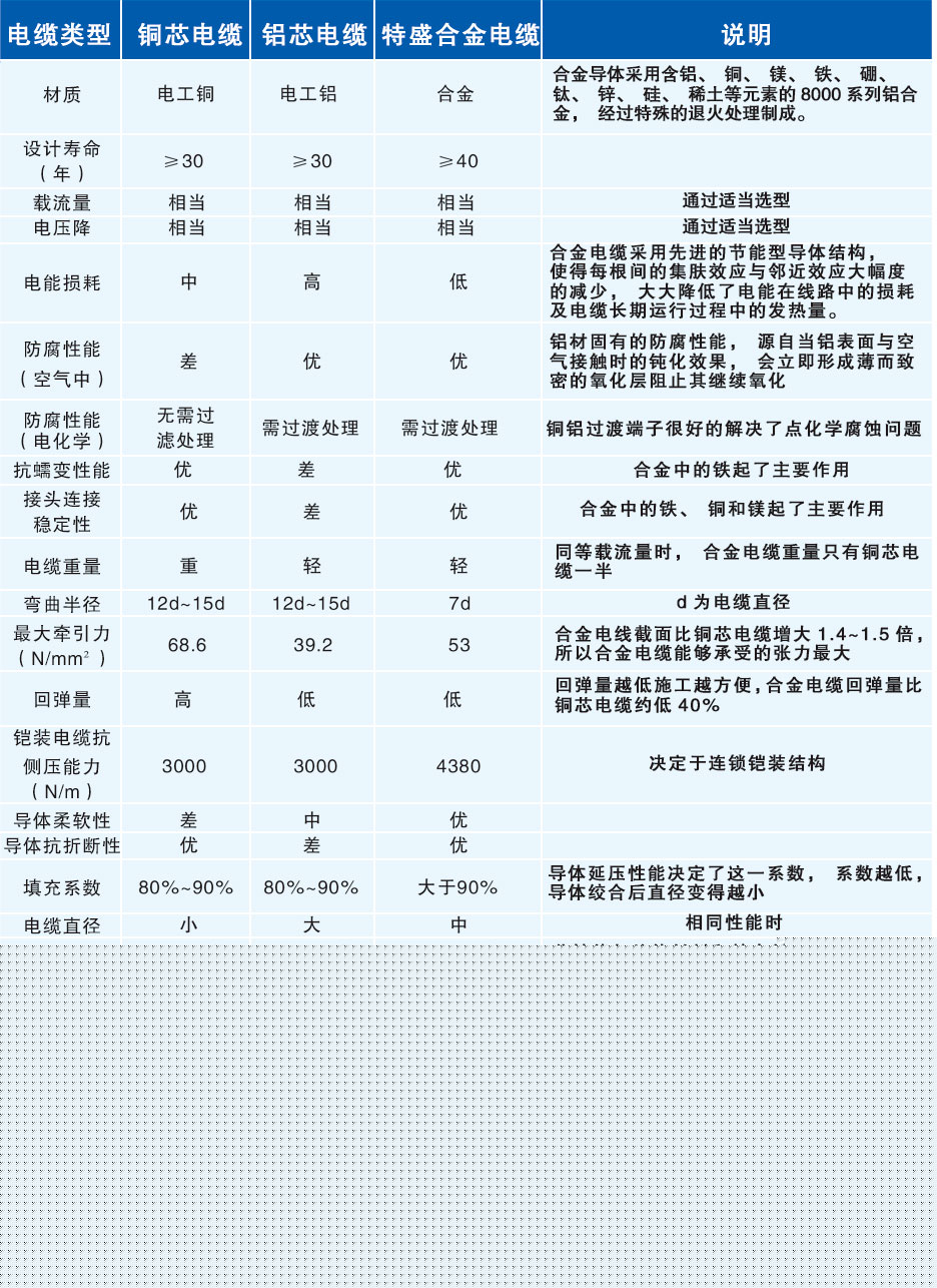 鋁合金芯電力電纜與銅或鋁芯電力電纜性能對比表