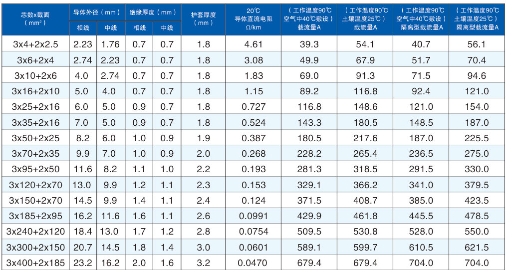 規格:3x4+2x2.5-3x400+2x185mm2    額定電壓:0.6/1KV