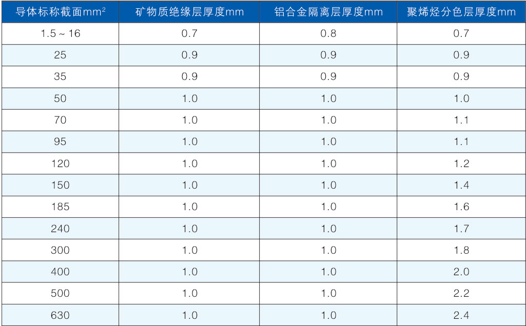 導體線芯的截麵積、礦物質絕緣層厚度、鋁合金隔離層的厚度和分色層厚度的關係表如下:
