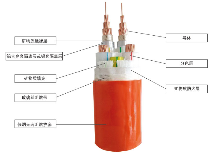 ①銅導體②金雲母帶絕緣③鋁合金金屬套④交聯隔離套⑤Mg(OH)或Al(OH)耐火層⑥無鹵成人抖音下载软件聚烯烴外護套